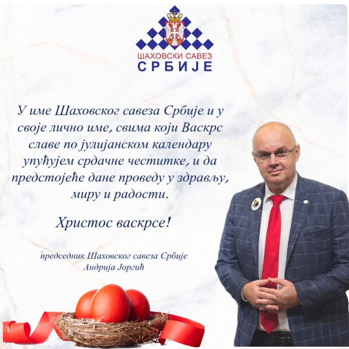 Predsednik Šahovskog saveza Srbije Andrija Jorgić uputio je svima koji slave Vaskrs po julijanskom kalendaru srdačne čestitke i da predstojeće praznične dane provedu u zdravlju, miru i radosti.